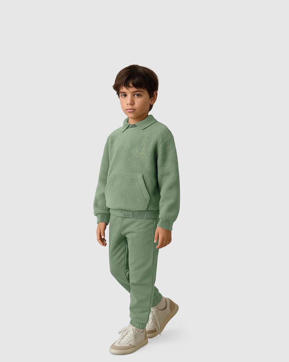 O Conjunto Carinhoso une modernidade e conforto para a coleção Outono Inverno 26. O blusão em pelúcia destaca-se pela gola retilínea e elegante bordado peitoral de cachorrinho, enquanto a calça em moletom flanelado garante o aquecimento ideal para os dias frios.