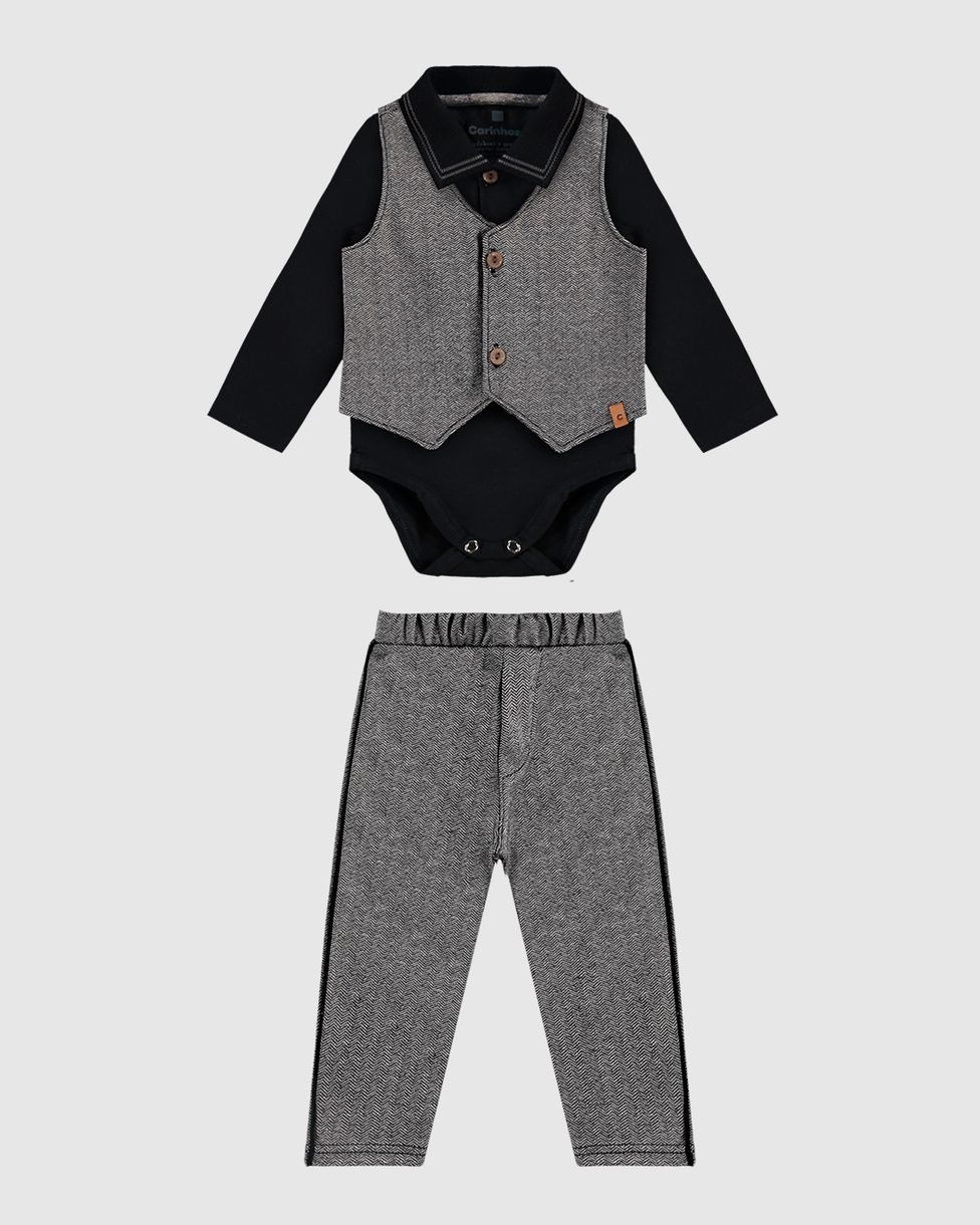 Conjunto Menino Body Manga Longa + Colete Botões + Calça - Carinhoso