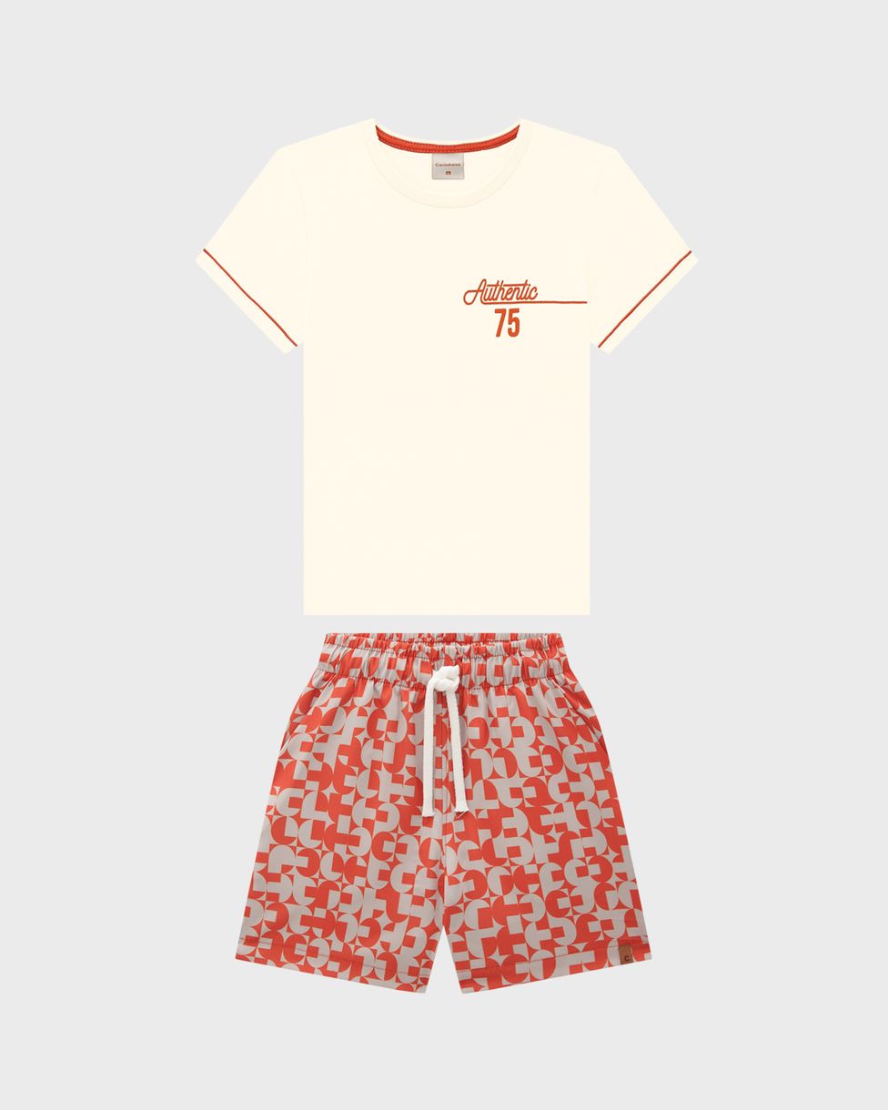 Conjunto Menino Camiseta Authentic 75 em Algodão - Carinhoso: Ideal para os meninos que valorizam autenticidade e conforto, este conjunto apresenta uma camiseta com estampa “Authentic 75”, em malha algodão e bermuda estampada feita em microfibra. Perfeito para um dia cheio de aventuras e diversão.
