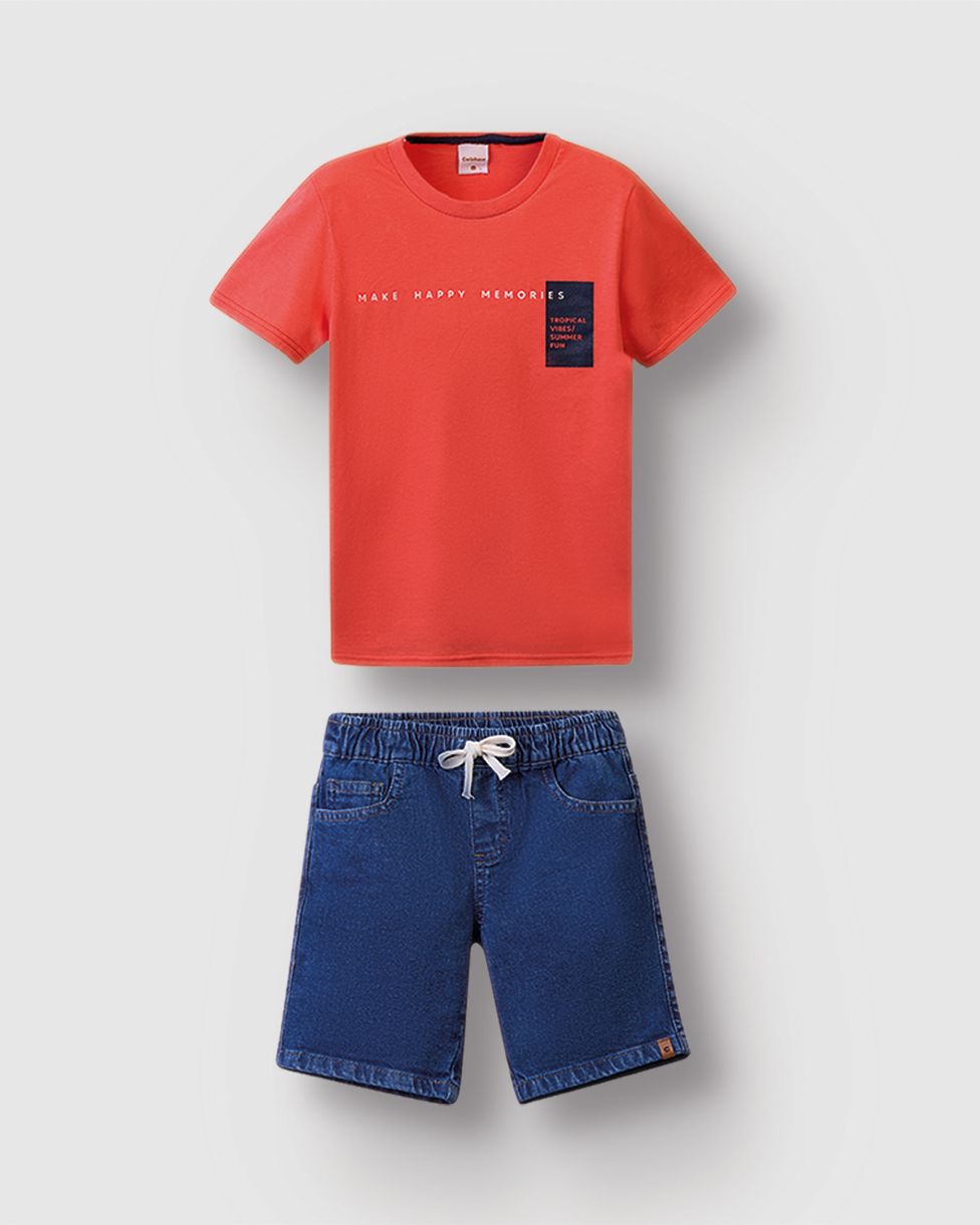 Perfeito para os meninos cheios de energia, o Conjunto Menino Carinhoso une o estilo da bermuda jeans stretch com a modernidade da camiseta. Sua estampa com efeito HD, inspirada na diversão do verão, é um convite para criar memórias felizes. Um look que combina conforto e atitude para qualquer aventura!