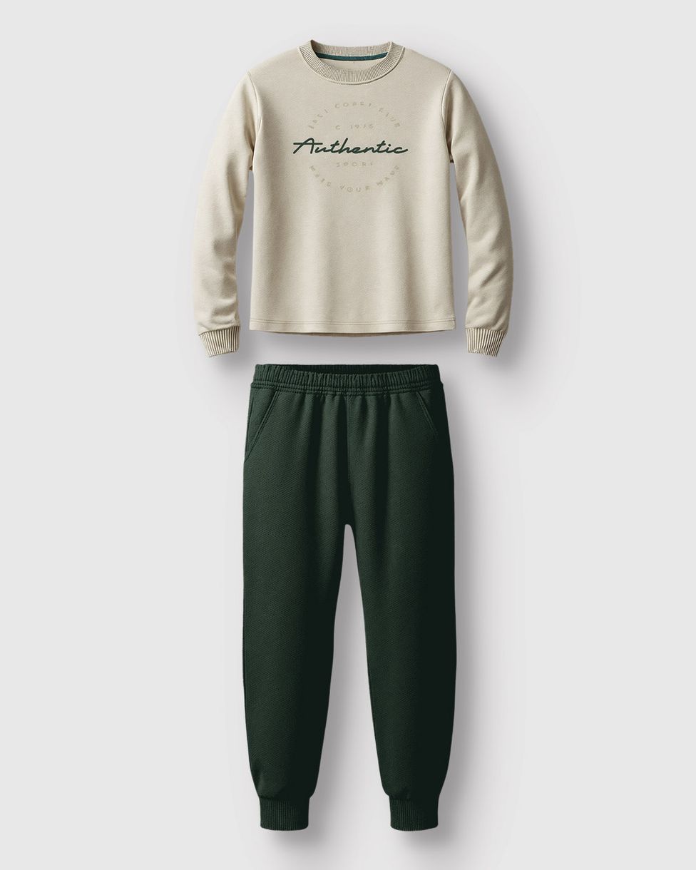 O Conjunto Carinhoso é a escolha ideal para um visual moderno e descomplicado na temporada Outono Inverno 26. A camiseta em meia malha traz uma estampa de lettering contemporânea, enquanto a calça em moletom oferece o conforto e a flexibilidade que os meninos precisam para explorar o mundo.