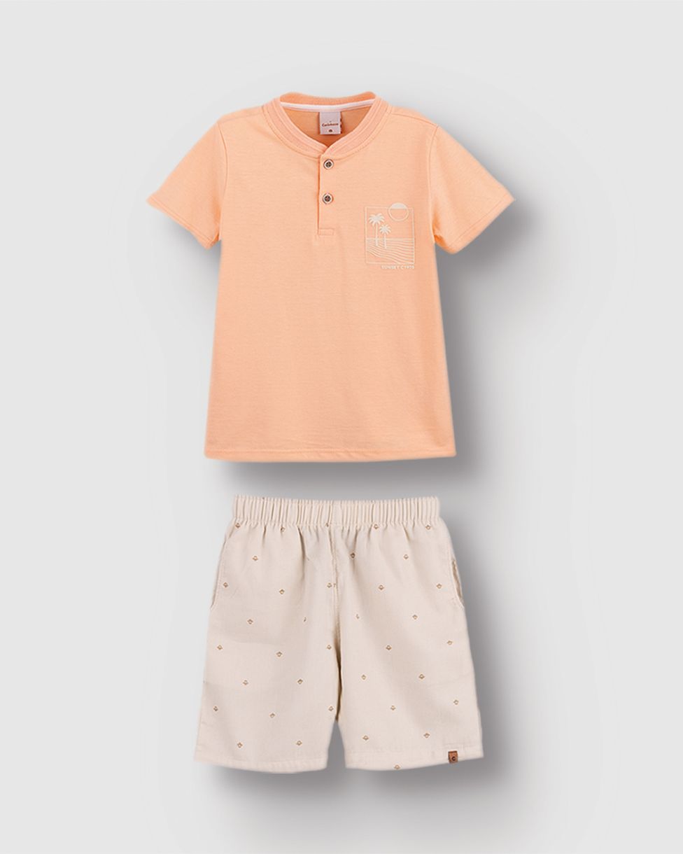Um look moderno e cheio de charme para os meninos! O Conjunto Camiseta e Bermuda Carinhoso é perfeito para qualquer ocasião. A camiseta com peitilho de botões é super estilosa, e a bermuda em algodão texturizado garante conforto e liberdade para se divertir o dia todo, sem abrir mão do estilo.