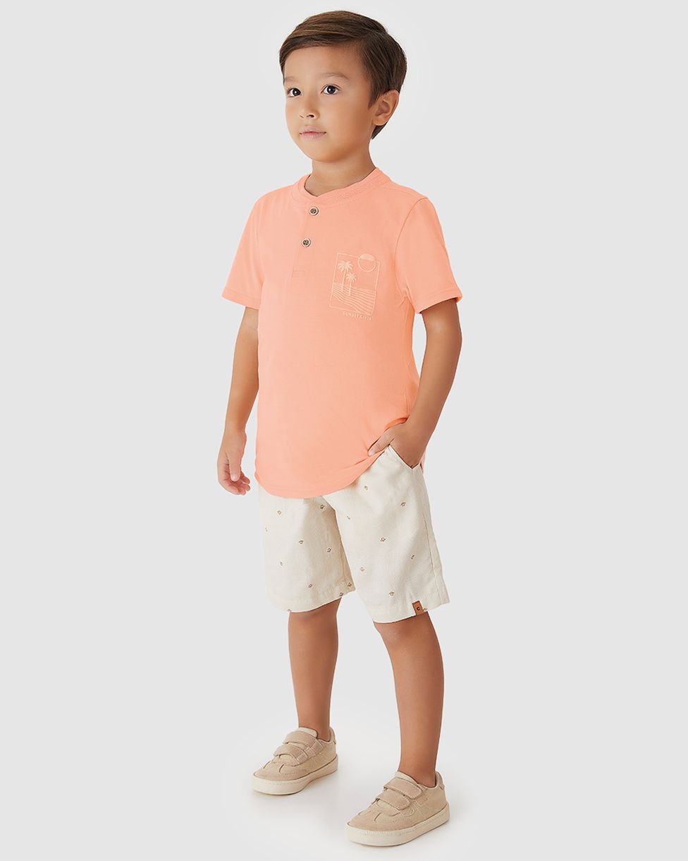 Um look moderno e cheio de charme para os meninos! O Conjunto Camiseta e Bermuda Carinhoso é perfeito para qualquer ocasião. A camiseta com peitilho de botões é super estilosa, e a bermuda em algodão texturizado garante conforto e liberdade para se divertir o dia todo, sem abrir mão do estilo.