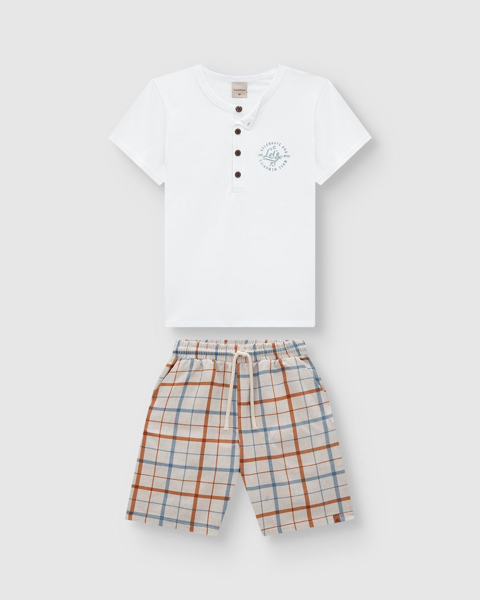 Conjunto Menino Camiseta Peitilho com Botões em Piquet Stretch - Carinhoso: Uma combinação perfeita de conforto e estilo para os meninos. A camiseta em piquet stretch, com peitilho e botões, oferece um visual moderno. A bermuda em viscolinho com estampa xadrez adiciona um toque estiloso para o dia a dia.