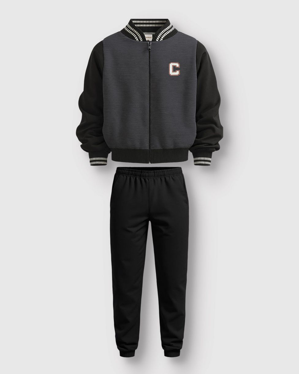 O Conjunto Jaqueta + Calça da Carinhoso é a escolha ideal para o Outono Inverno. Combinando a sofisticação da malha texturizada ao conforto do moletom stretch flanelado, este look estilo "bomber" oferece um visual moderno e aquecido para os meninos em qualquer ocasião.