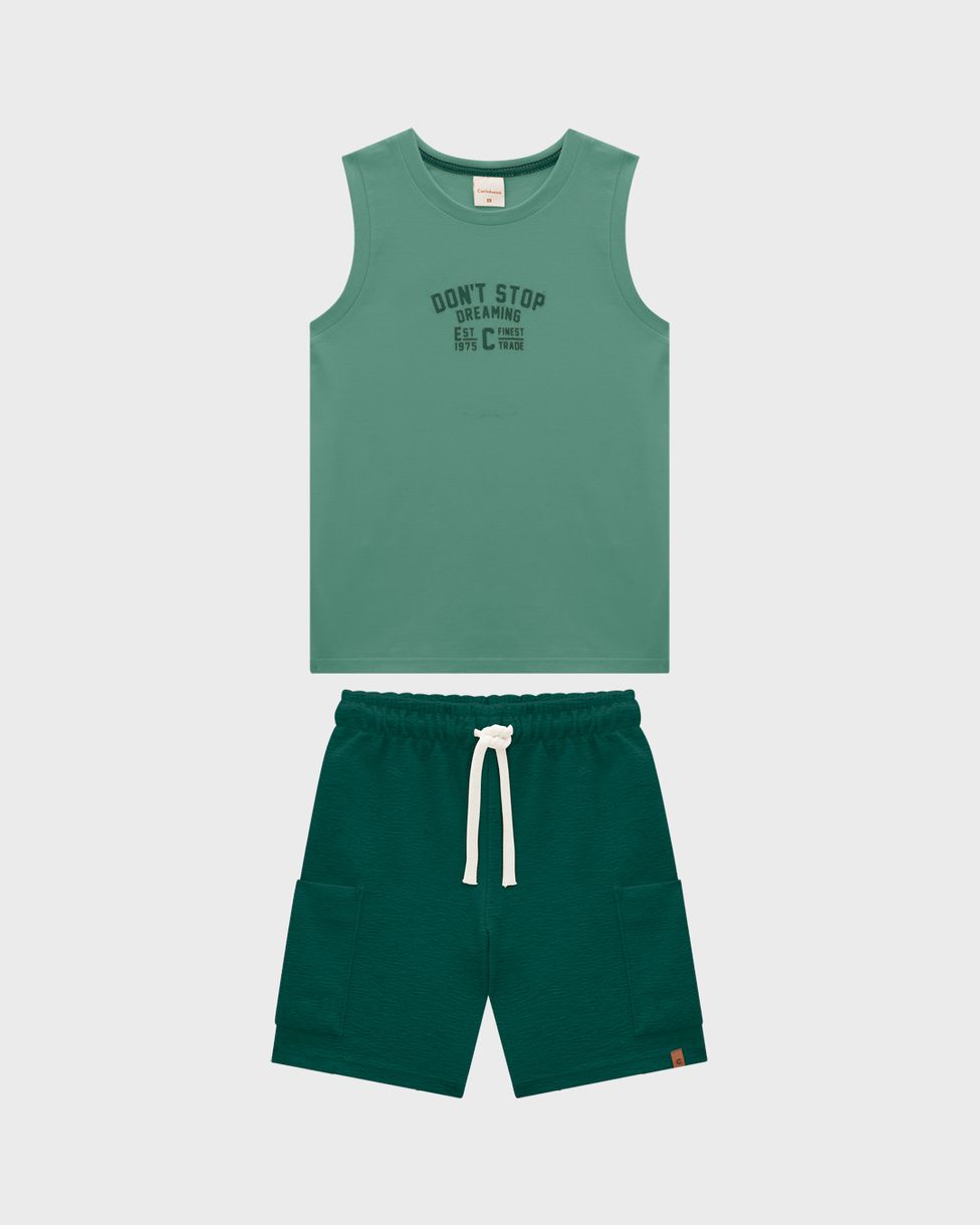 Conjunto Menino Regata Don’t Stop Dreaming em Algodão - Carinhoso: Inspirando os meninos a sonharem alto, este conjunto oferece conforto e estilo. A regata com a mensagem motivacional “Don’t Stop Dreaming” é confeccionada em algodão, garantindo suavidade e frescor durante todo o dia. A bermuda feita em malha texturizada complementa o conjunto.