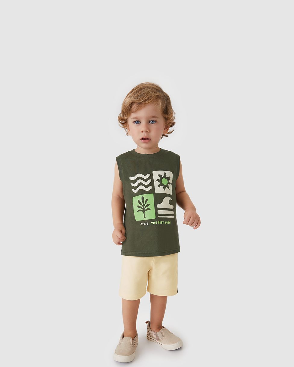 Perfeito para os dias mais quentes, o Conjunto Regata Carinhoso é a melhor vista para o verão do seu menino! A estampa moderna “The Best View”, com efeito de alta definição, celebra a natureza e a diversão, enquanto o tecido de algodão garante frescor e conforto para todas as brincadeiras. Um look vibrante e cheio de estilo.