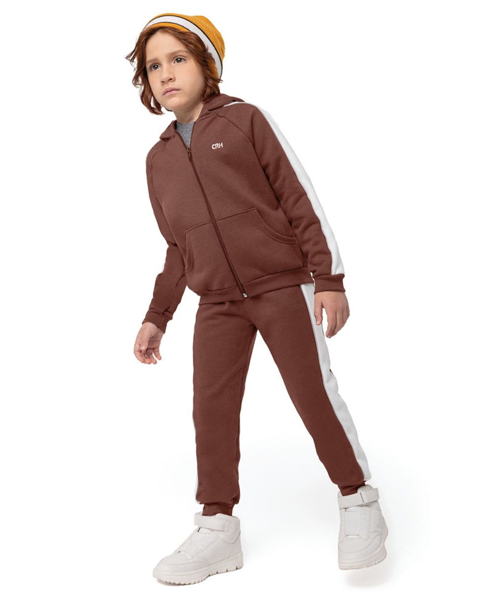 Conjunto confeccionado em moletom 3 cabos e malha de algodão. Apresentando um conjunto super estiloso e essencial para os dias mais frios, é um conjunto com modelagem Unissex, para os meninos e meninas. A Jaqueta com capuz forrado, também apresenta zíper frontal, recortes em tom contraste nas mangas, bolso canguru e barra e punhos marcados. Ja a sua parte inferior em calça Jogger, com barras afuniladas conta com cintura em elastico e recortes nas laterais. Complete com tênis!