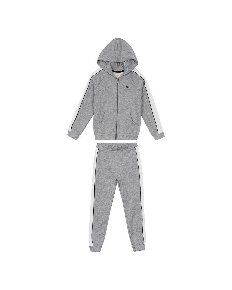 Conjunto confeccionado em moletom 3 cabos e malha de algodão. Apresentando um conjunto super estiloso e essencial para os dias mais frios, é um conjunto com modelagem Unissex, para os meninos e meninas. A Jaqueta com capuz forrado, também apresenta zíper frontal, recortes em tom contraste nas mangas, bolso canguru e barra e punhos marcados. Ja a sua parte inferior em calça Jogger, com barras afuniladas conta com cintura em elastico e recortes nas laterais. Complete com tênis!