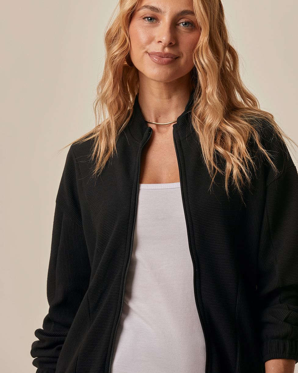 Jaqueta Ampla Feminina Fecho Zíper Em Malha Texturizada Canelada Preto - P