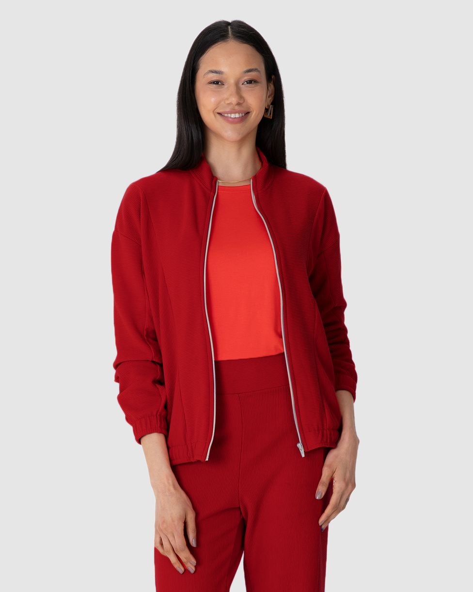 Jaqueta Ampla Feminina Fecho Zíper Em Malha Texturizada Canelada Vermelho - P