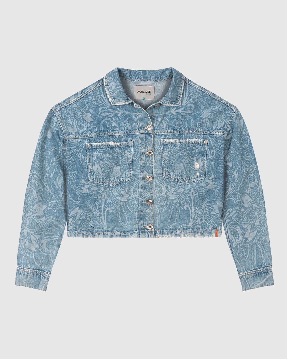 Jaqueta feminina confeccionada em jeans 100% algodão. Essa jaqueta Cropped é super moderna, com comprimento na altura da cintura, apresenta gola, mangas longas com abertura, vista frontal por botões e bolsos dianteiros com detalhe em puídos. A peça ainda apresenta recortes nas costas e etiqueta clips costurada na barra. Outra novidade é a estampa à laser, uma escolha mais sustentável, que está alinhada com a tendência do momento, em motivos ao estilo Boho, como a estampa Paisley. Invista com blusa básica sobreposta, shorts jeans da mesma Malwee estampa e tênis flatform!
