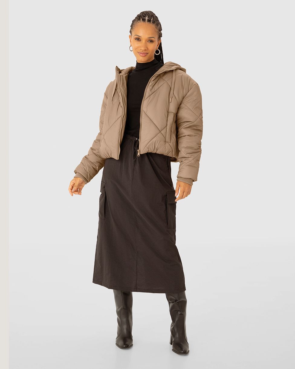 deal para manter você aquecida com estilo, essa jaqueta une praticidade e conforto. O design puffer garante isolamento térmico, enquanto o capuz removível e o forro peletizado oferecem proteção adicional nos dias mais frios.