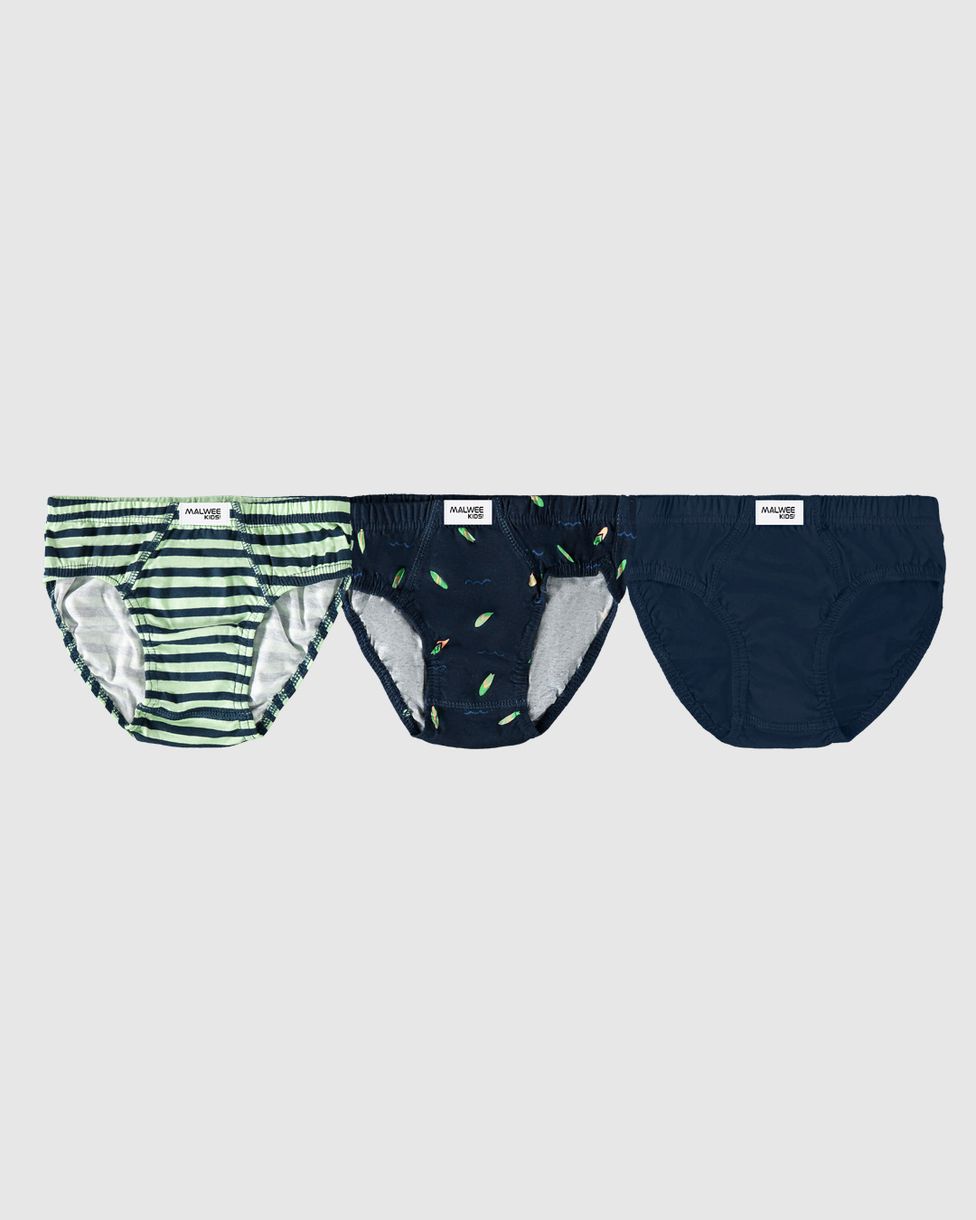 Kit de cuecas infantis confeccionadas em malha 100% algodão. Em modelagem Slip, as peças contam com cós aplicado em elástico e etiqueta decorativa no frontal. O kit possui 3 variações entre peças estampadas e lisas. Para total conforto dos meninos!