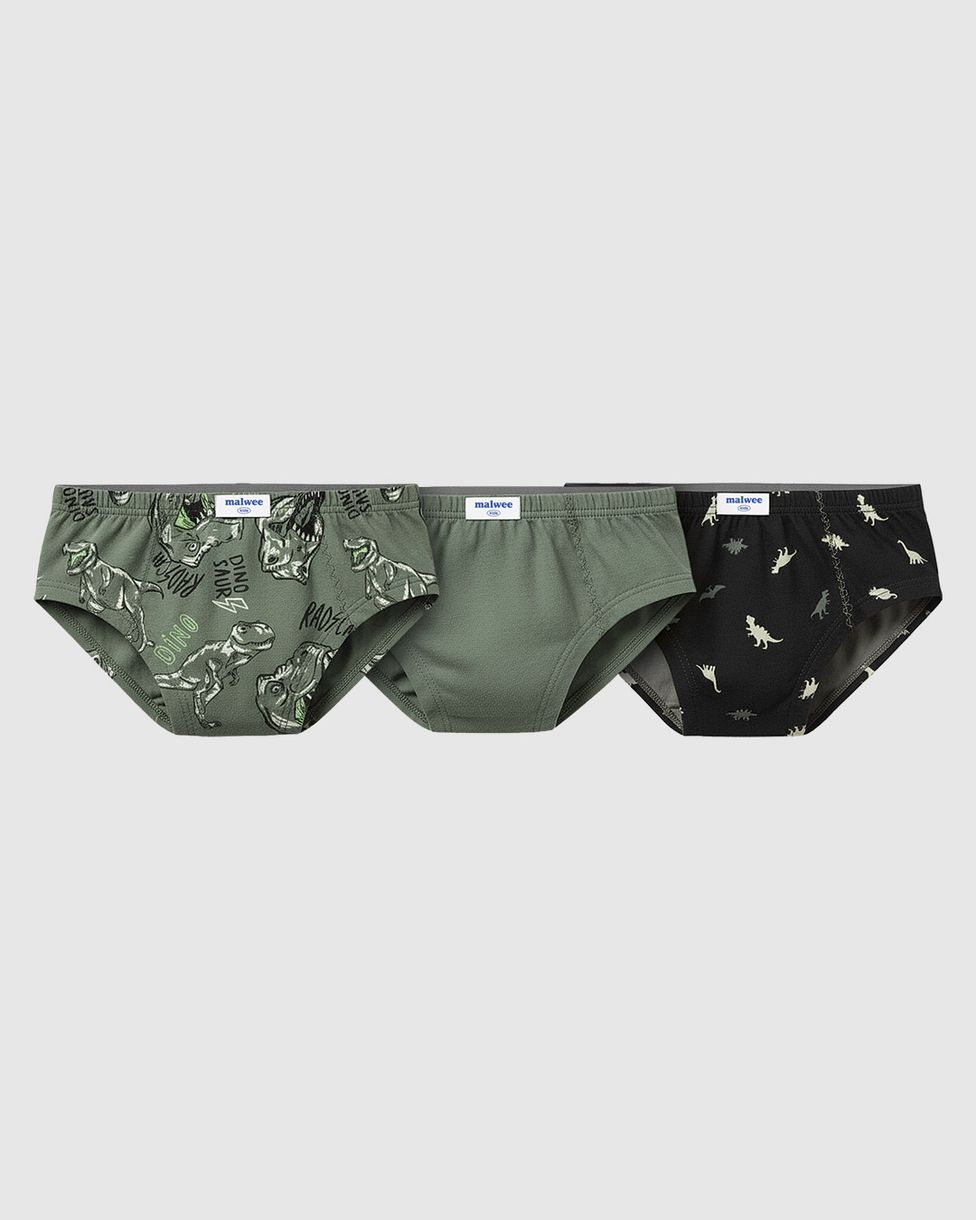 Kit de cuecas infantis confeccionadas em malha 100% algodão. Em modelagem Slip, as peças contam com cós aplicado em elástico e etiqueta decorativa no frontal. O kit possui 3 variações entre peças estampadas e lisas. Para total conforto dos meninos!