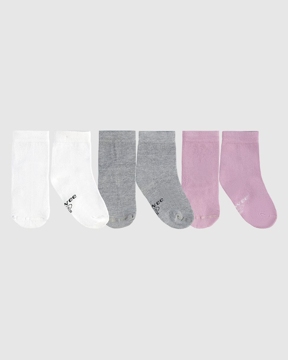 Kit com 3 meias infantis confeccionadas nos tecidos de algodão, poliamida, elastano e outras fibras. Modelo Unissex, o kit possui 3 meias na cores preto, cinza e branco. Com detalhe de marcação de costura na ponta de meia. Servindo as numerações 16-20,21-25,26-30, 31-35 e 35-39.