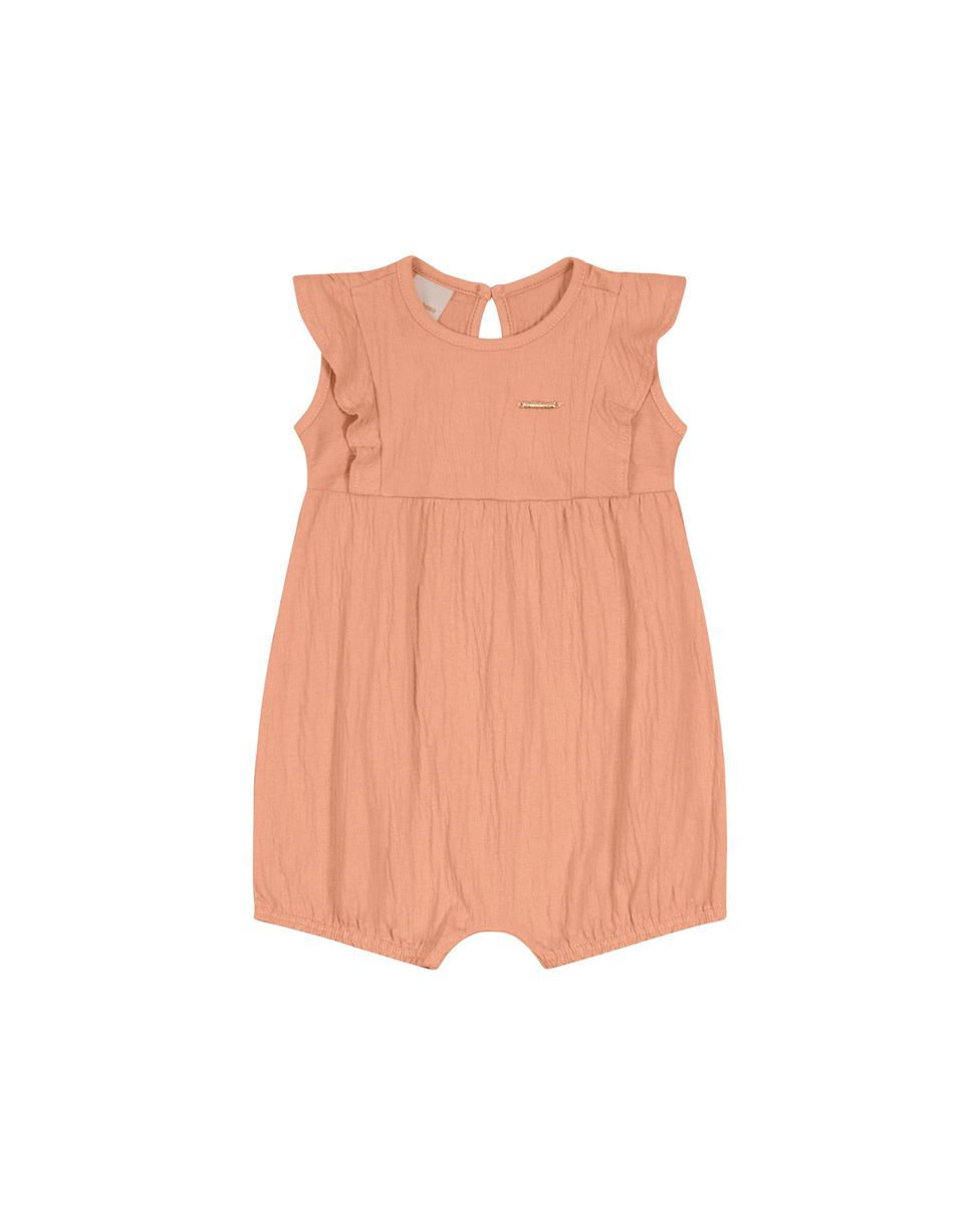 Macacão confeccionado em tecido de malha texturizada. O macacão é uma peça única que oferece muita praticidade para as meninas e nesta verão em tecido de malha, apresenta decote redondo, mangas curtas com babados, abertura nas costas, barra com elástico e abertura entre pernas com fechamento em botão de pressão. Com detalhe de plaqueta metálica da Carinhoso no peitoral. Uma peça delicada para os melhores momentos!