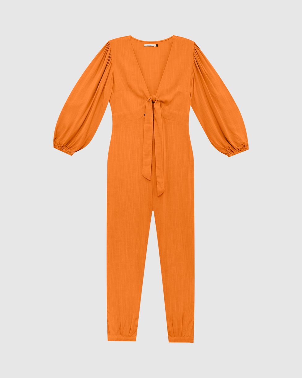 Macacão confeccionado em tecido de viscose. Um macacão elegante e leve para usar na estação, essa peça conta com decote V com detalhe de laço frontal, manga bufante com elástico e recorte na linha da cintura. Além disso, o tecido de viscose se destaca por ser maleável e de toque macio, possuindo bom caimento e frescor, sendo ideal para o uso em dias mais quentes. Aposte com sapato mocassim, para um visual clássico!