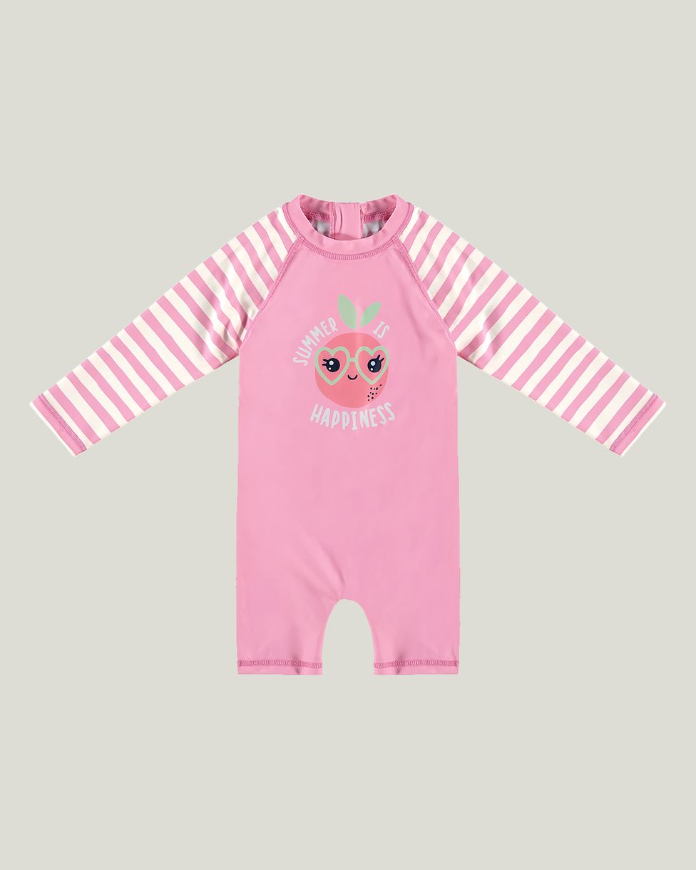 Macacão infantil confeccionado em malha UV50+. Em modelo Unissex e de comprimento curto, essa peça possui decote redondo, mangas longas com estampa listrada e estampa frontal de ilustração e a inscrição "Summer Is Happiness: Verão É Felicidade". Essa peça possui tecnologia de proteção UV50+ contra os raios solares, tecnologia Dry, que promove a difusão do suor corporal e também conta com HIGHCLO, que possui resistência ao cloro, proporcionando durabilidade três vezes maior que um produto com elastano convencional. Um item confortável e estiloso para os momentos de lazer das crianças!