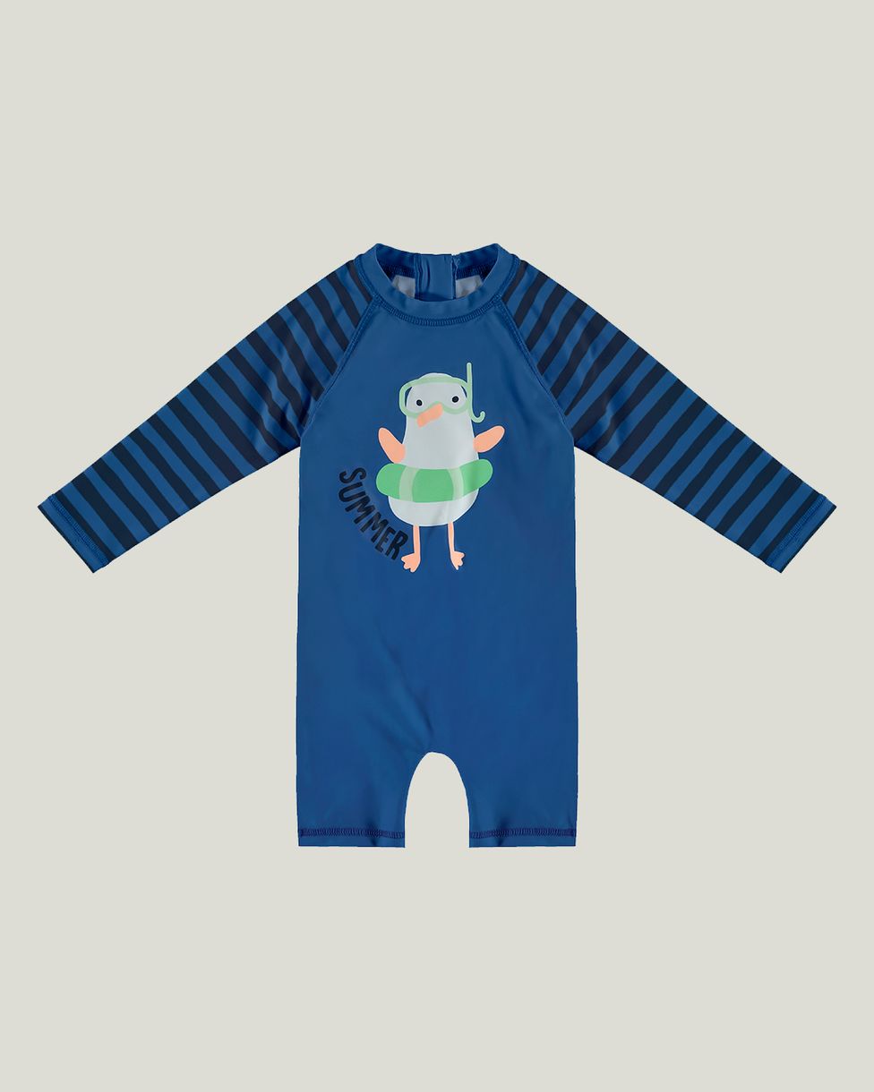 Macacão infantil confeccionado em malha UV50+. Em modelo Unissex e de comprimento curto, essa peça possui decote redondo, mangas longas com estampa listrada e estampa frontal de ilustração de patinho e a inscrição "Summer: Verão". Essa peça possui tecnologia de proteção UV50+ contra os raios solares, tecnologia Dry, que promove a difusão do suor corporal e também conta com HIGHCLO, que possui resistência ao cloro, proporcionando durabilidade três vezes maior que um produto com elastano convencional. Um item confortável e estiloso para os momentos de lazer das crianças!