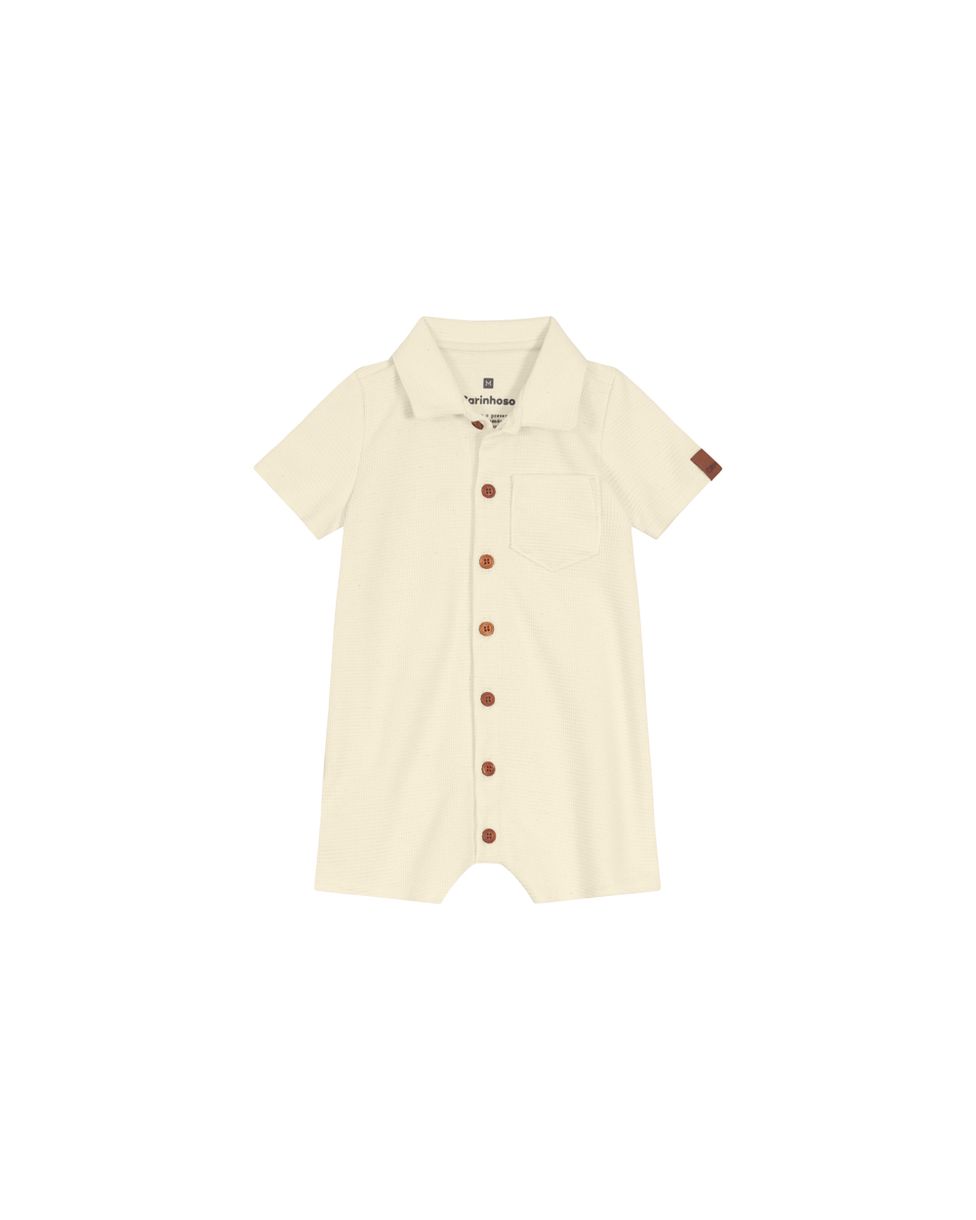 Macacão confeccionado em tecido de malha texturizada. O macacão é uma peça única que oferece muita praticidade para os meninos e nesta versão em tecido de malha, apresenta gola tradicinal com fechamento por botões e mangas curtas com detalhe de etiqueta decorativa. Com bolso no peitoral. Uma peça delicada para os melhores momentos!