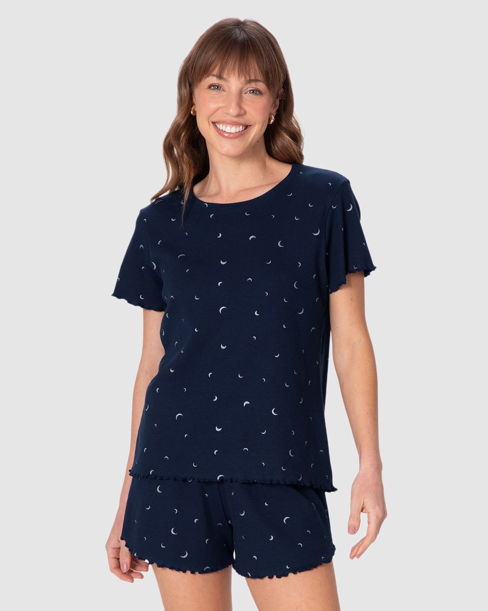 Pijama Curto Feminino Blusa E Shorts Runner Estampa Com Glitter Em Ribana Azul - P