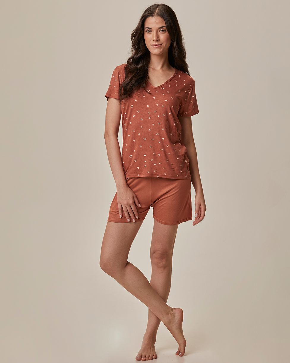 Pijama Curto Feminino Blusa Estampada E Shorts Meia Coxa Em Viscose Stretch Marrom - XGG