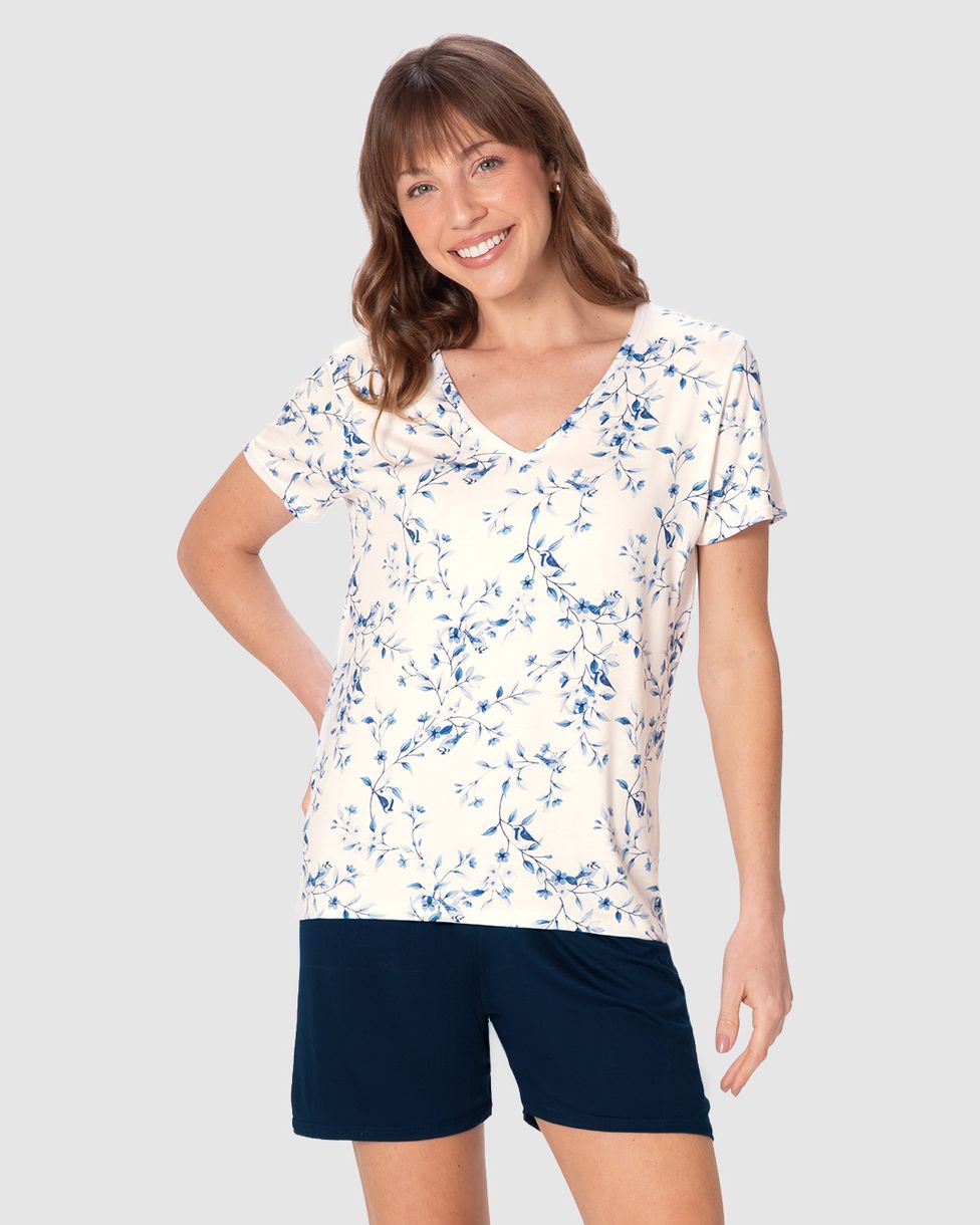 Pijama Curto Feminino Blusa Estampada E Shorts Meia Coxa Em Viscose Stretch