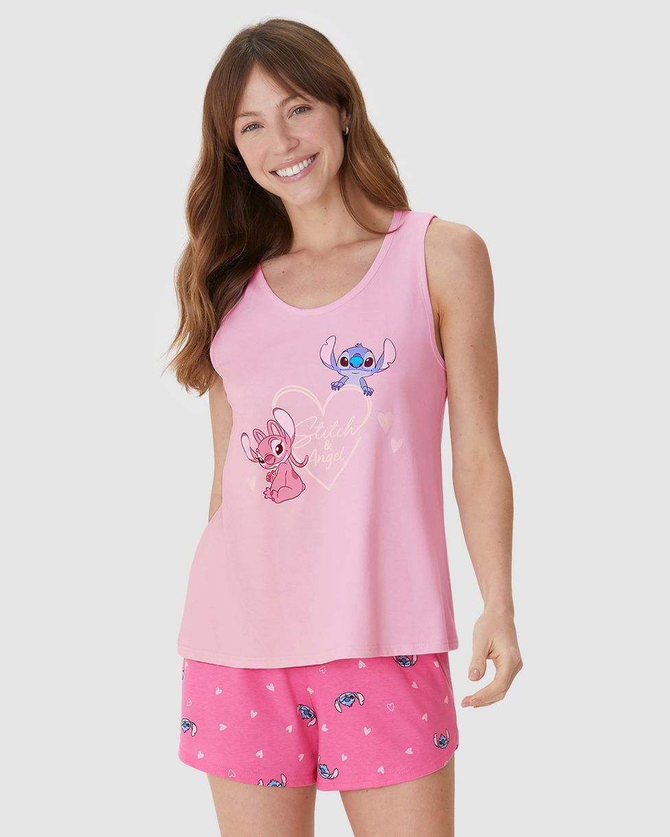 Pijama Curto Feminino Estampa Stitch E Angel Disney Em Algodão