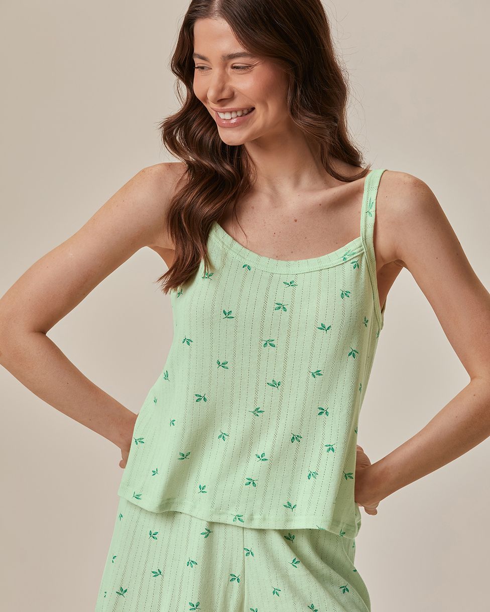 Pijama Curto Feminino Estampado Em Malha Jacquard Texturizada Verde - P