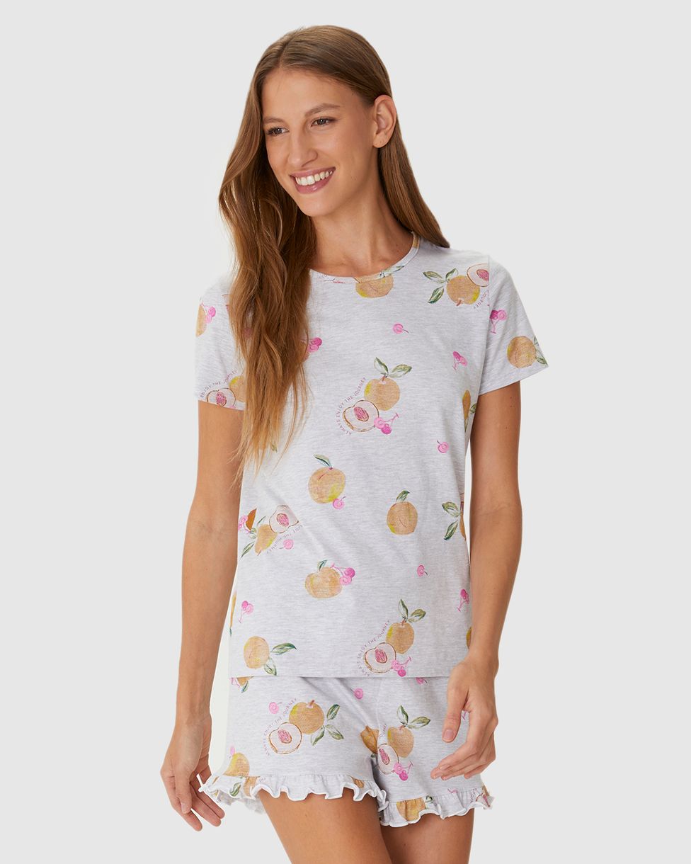 Pijama Curto Feminino Estampado Shorts Barra Picot Em Algodão