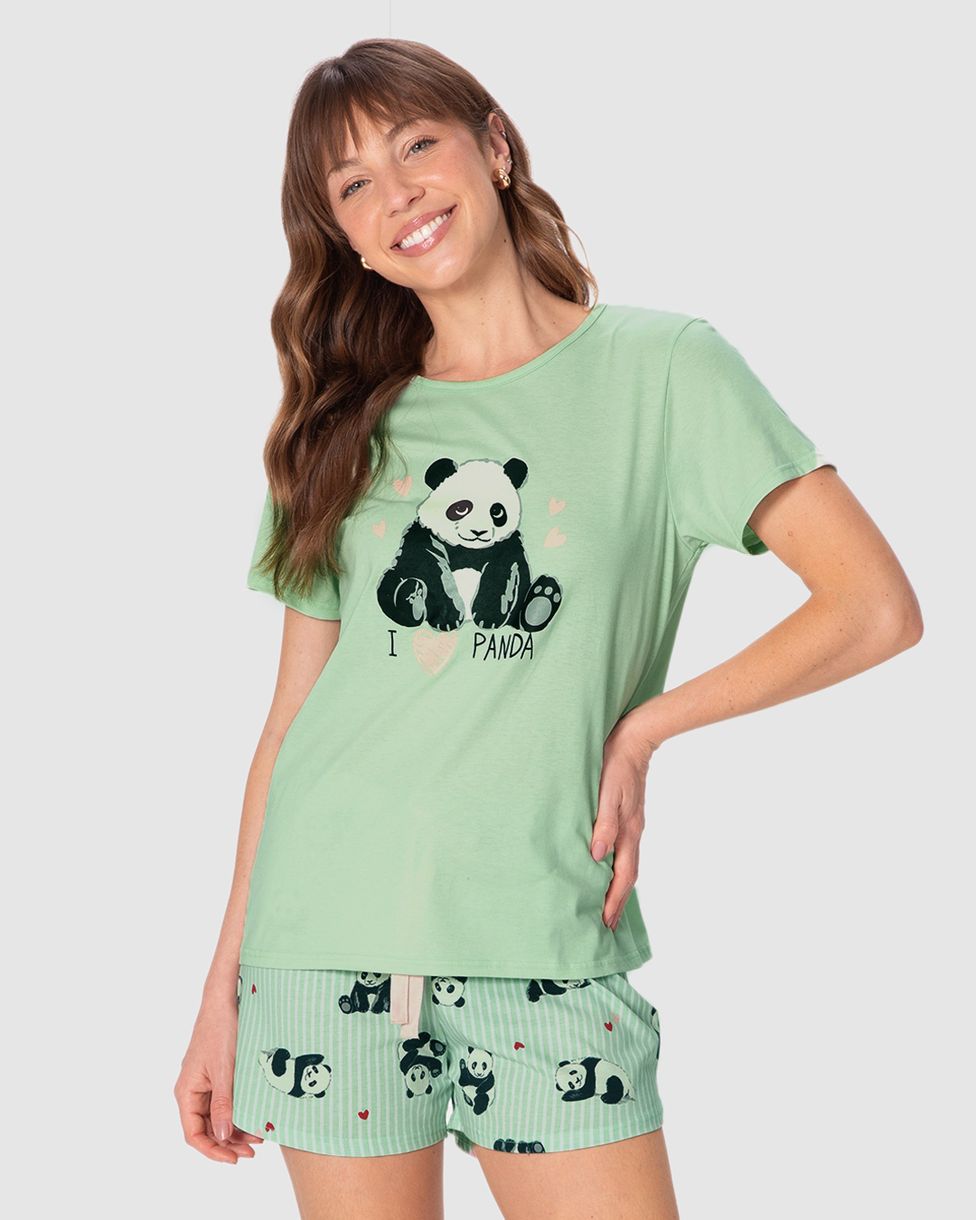 Pijama Curto Feminino Shorts Runner Estampado Em Malha Algodão Verde - P
