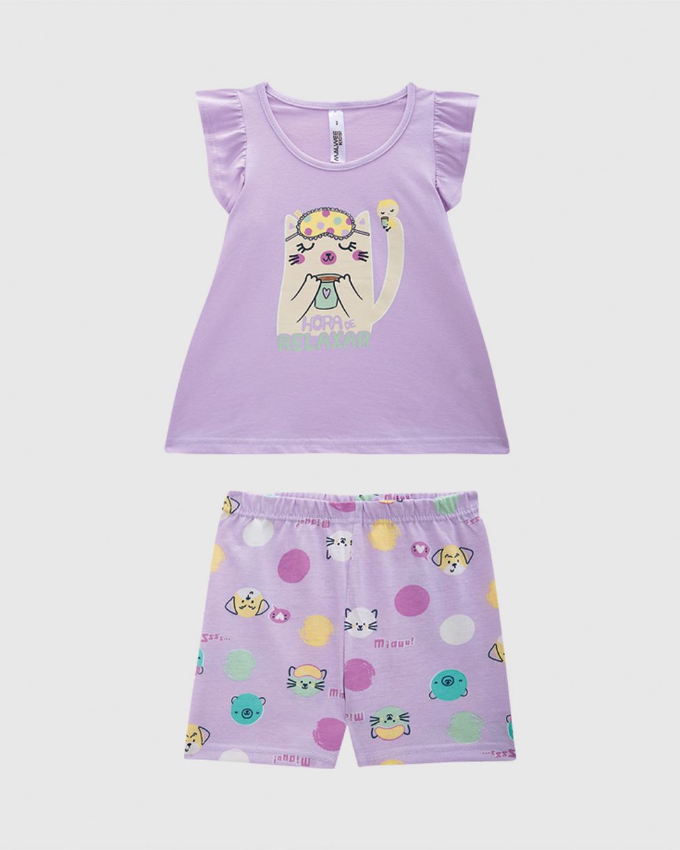 Pijama Curto Infantil Menina Blusa Manga Franzida Em Algodão Malwee Kids