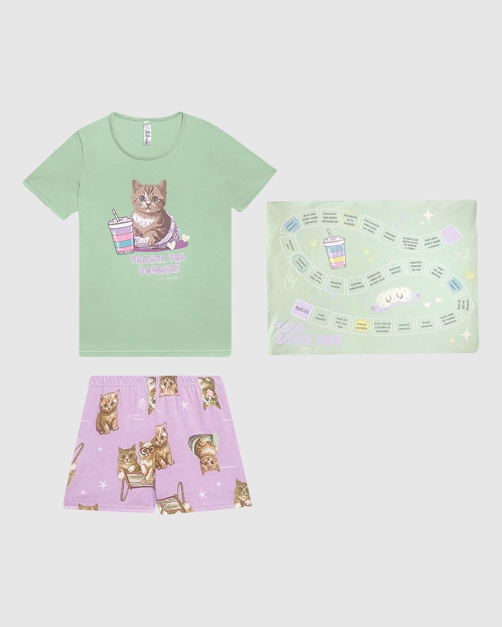 O Pijama Curto Infantil Menina Pronta Para Dormir Malwee Kids é um combo irresistível de conforto e diversão! Este conjunto de camiseta e shorts, feito em malha 100% algodão, é super leve e macio, ideal para as noites de Alto Verão. A estampa fofa de gatinho com a frase "Pronta pra dormir" possui tinta especial que brilha no escuro. E o melhor: ele acompanha uma Fronha Estampada que também brilha no escuro, completando a experiência de sono mágico!