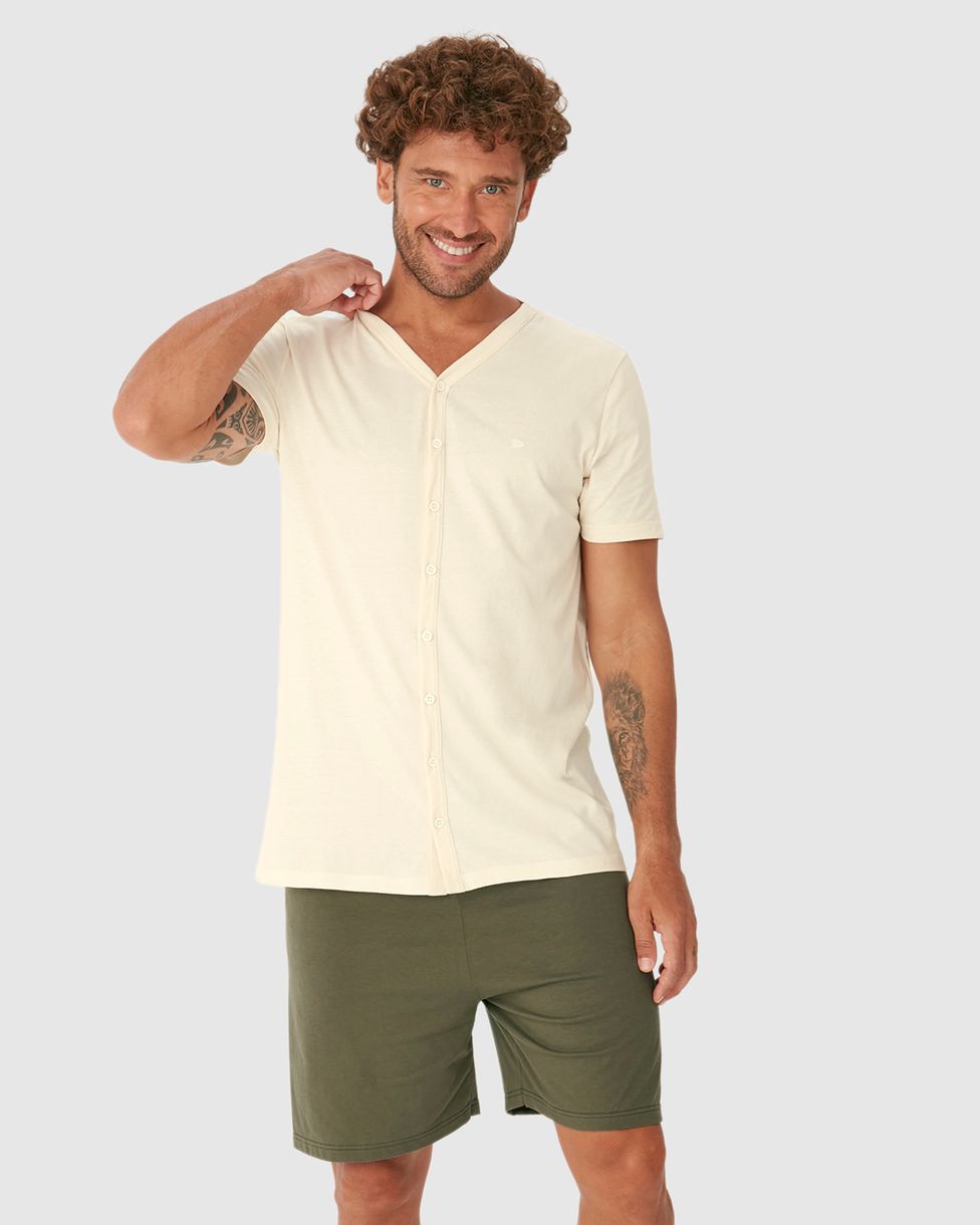 Pijama Curto Masculino Camiseta Decote V Abotoamento Frontal Em Algodão