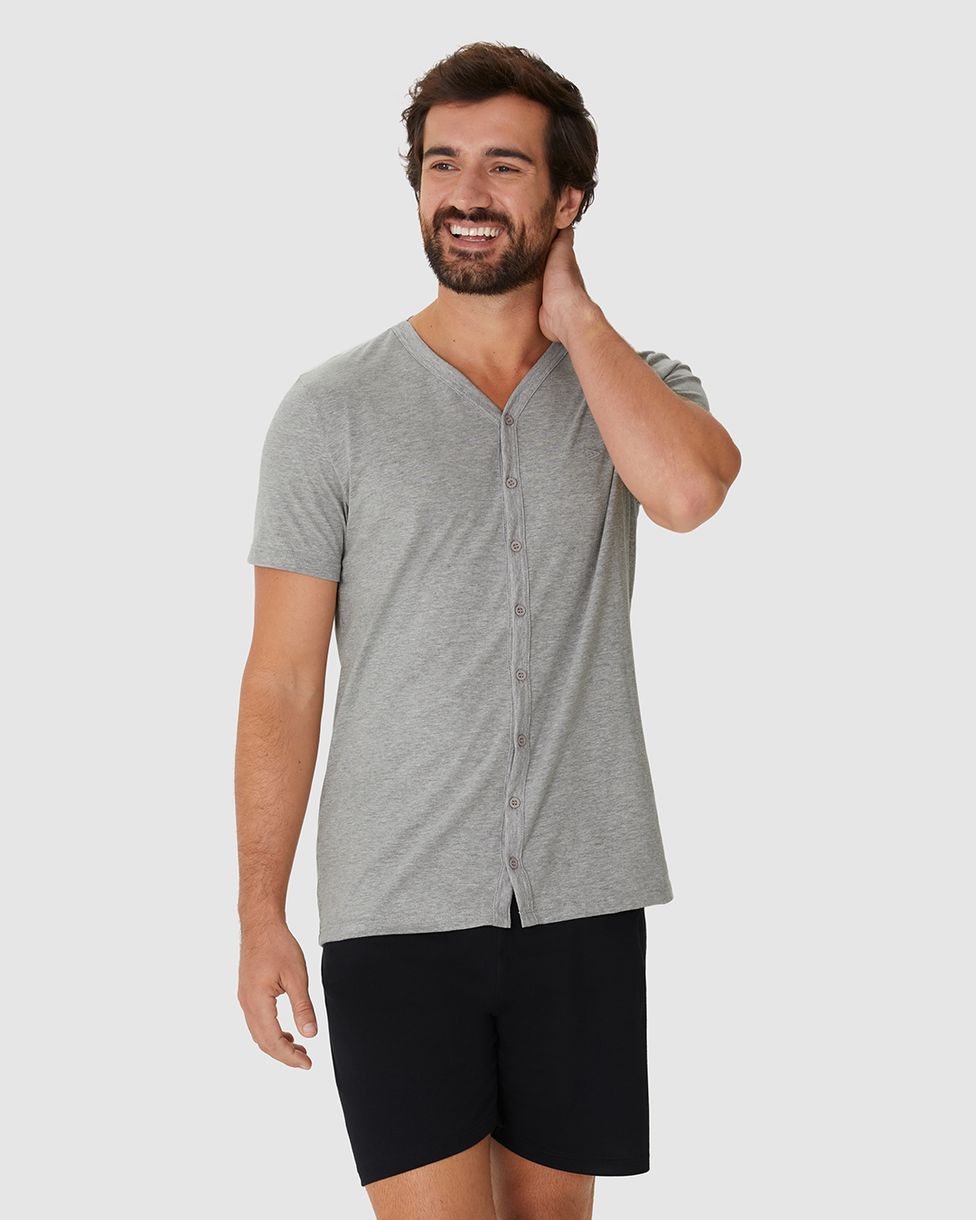 Pijama Curto Masculino Camiseta Decote V Abotoamento Frontal Em Algodão