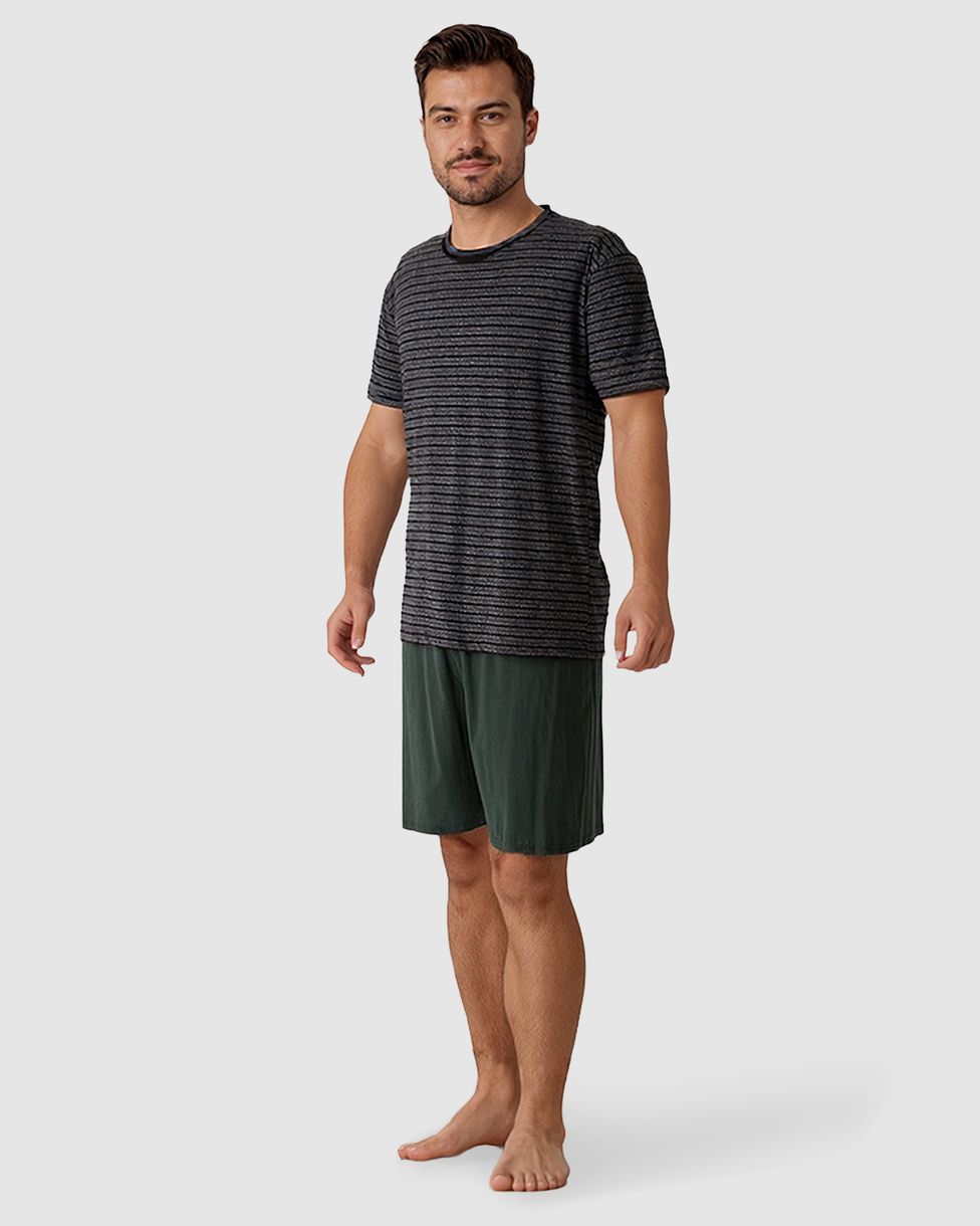 Pijama Curto Masculino Camiseta Gola Contraste Em Malha Listrada