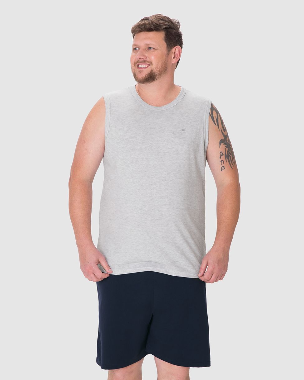 Pijama Curto Masculino Plus Size Regata Detalhe Bordado Em Algodão Cinza - G1