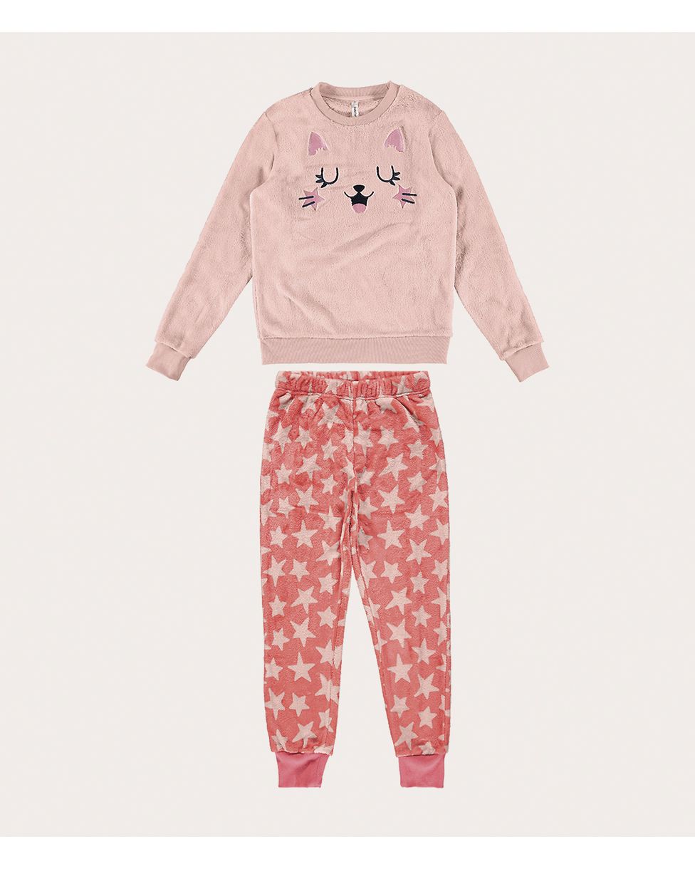 Pijama feminino confeccionado em Fleece, um tecido de pelúcia e super quentinho. Apresentando parte superior em Blusão de gola redonda, mangas longas e bordado frontal. A calça estampada complementa o conjunto, sendo super confortável, com cós em elástico e barras afuniladas. O pijama perfeito para quecer as mamães e suas filhas!