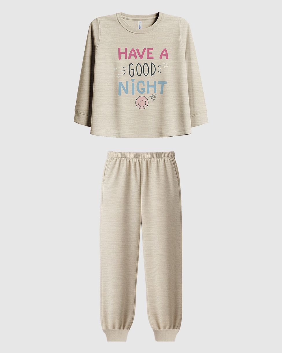 O Pijama Infantil Menina Malwee Kids garante noites de sono tranquilas e cheias de estilo. Confeccionado em meia malha, o conjunto oferece o toque suave do algodão, proporcionando frescor e conforto. A blusa com a estampa "Have a Good Night" e a calça coordenada são perfeitas para momentos de descanso.