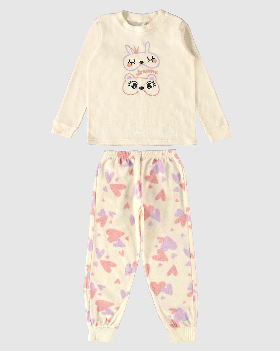 Pijama infantil feito em malha soft de poliéster, super quentinho e confortável. Blusa que possui gola redonda, mangas longas e estampa frontal "Dreams". A calça complementa o pijama, com cintura em elástico e barra afunilada. Perfeito para noites de inverno!