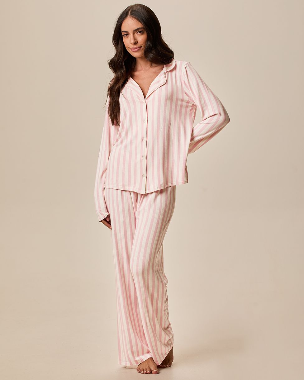 Pijama Longo Feminino Americano Estampa Listrada em Viscose Stretch Rosa - XGG