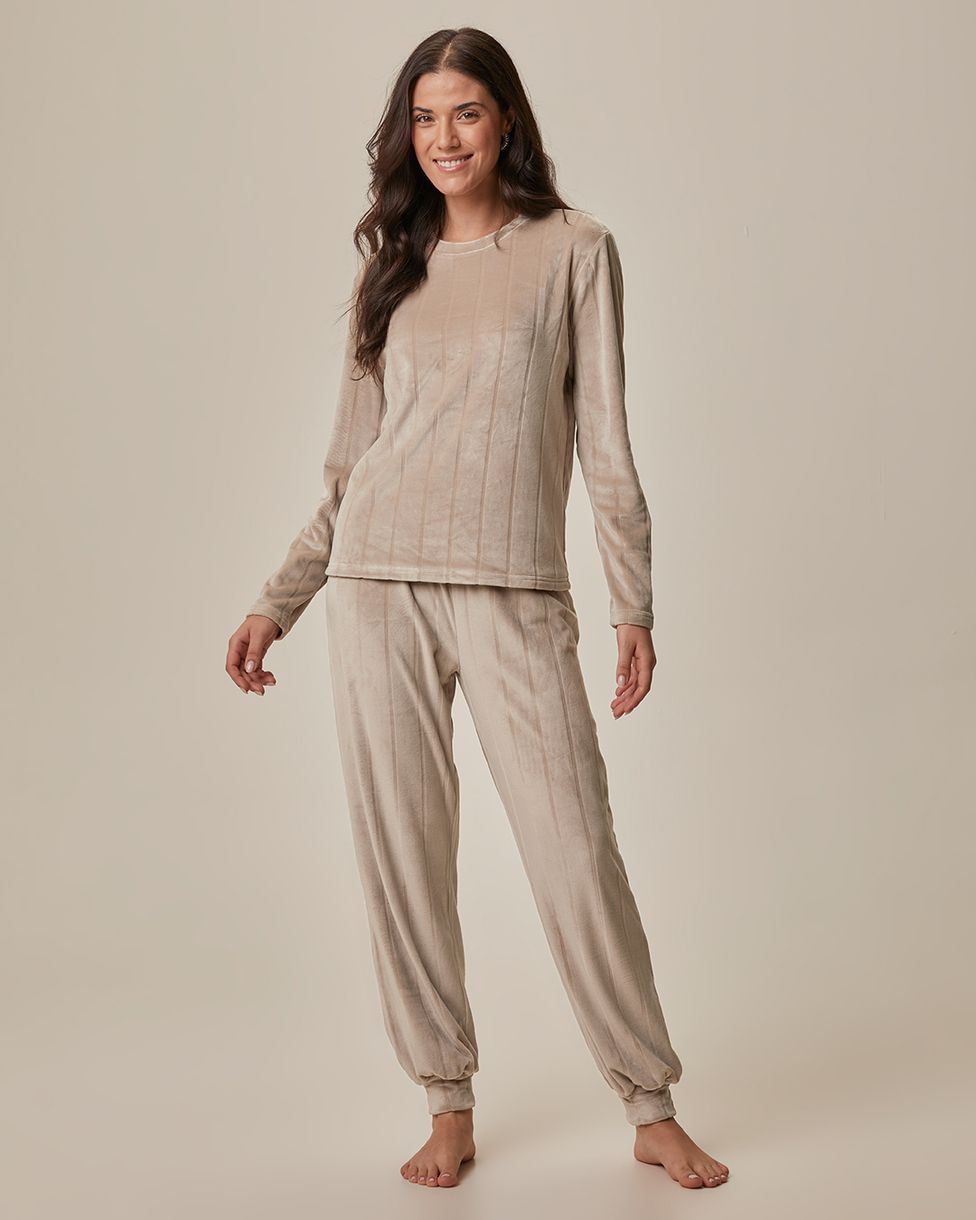 Pijama Longo Feminino Blusa Manga Longa E Calça Em Fleece Texturizado