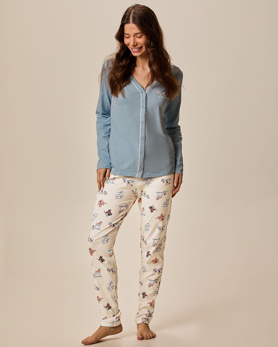 Pijama Longo Feminino Camiseta Abotoamento Frontal Em Malha 100% Algodão Azul - XGG