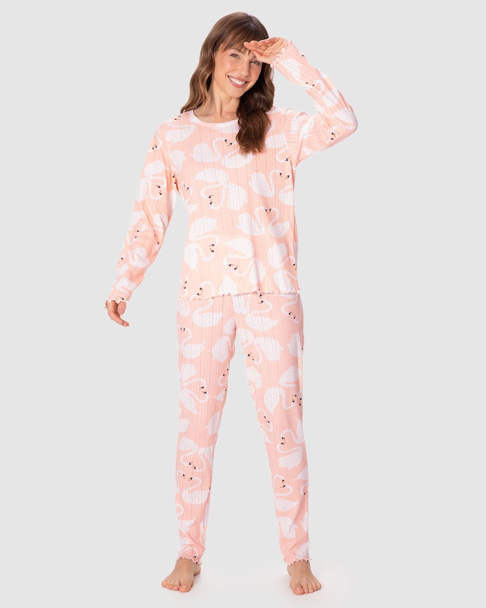 Pijama Longo Feminino Estampado Em Malha Jacquard Texturizada