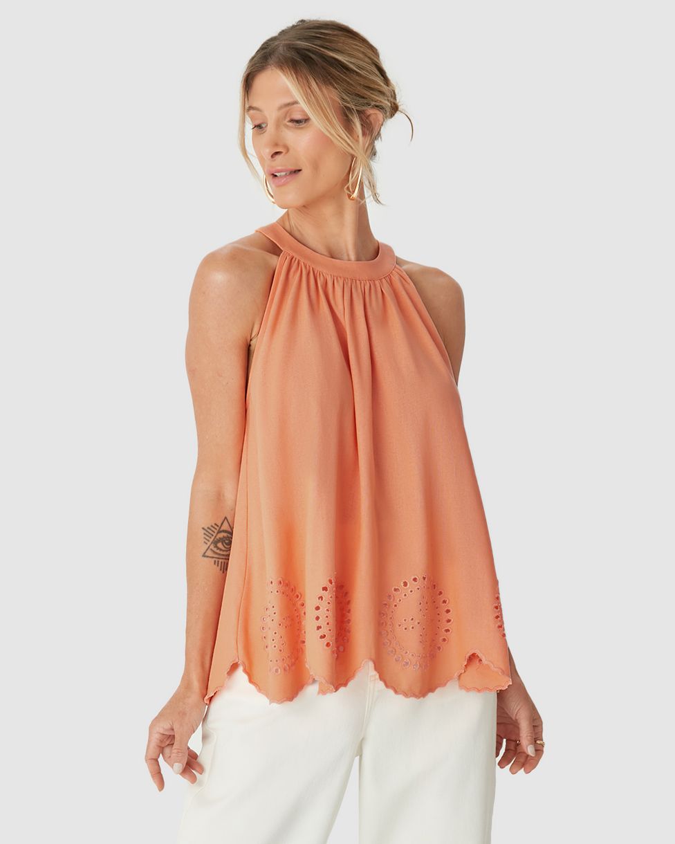Regata Ampla Feminina Amarração Costas Em Viscolinho Bordado Laranja - G