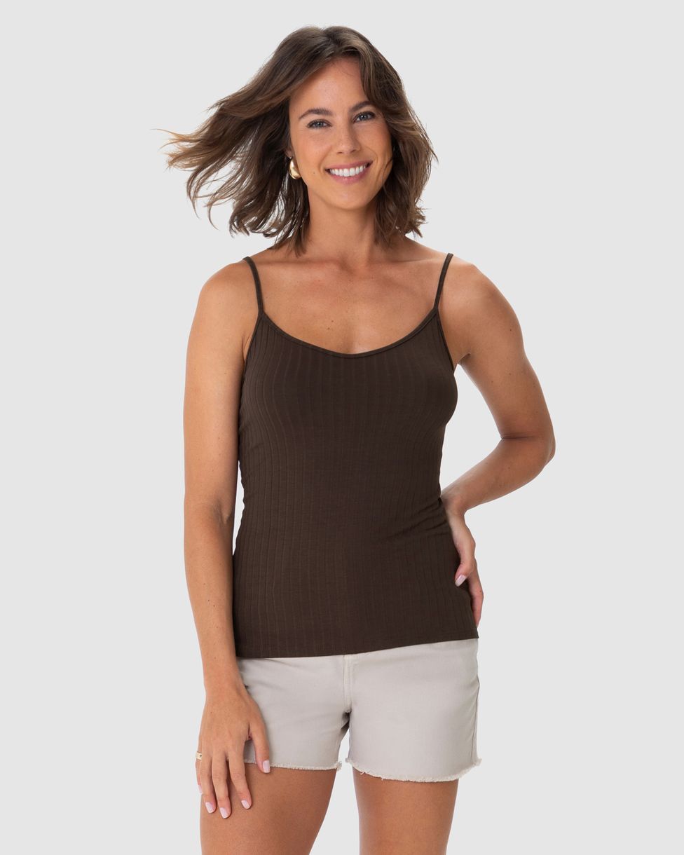 FemininoBlusas e CamisetasBlusas BásicasRegata Básica Feminina Alça Fina Em Canelada De Viscose