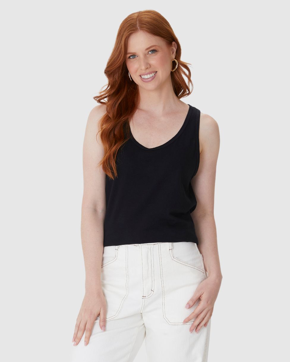 Regata Básica Feminina Alça Larga Em Malha Linho Preto - G