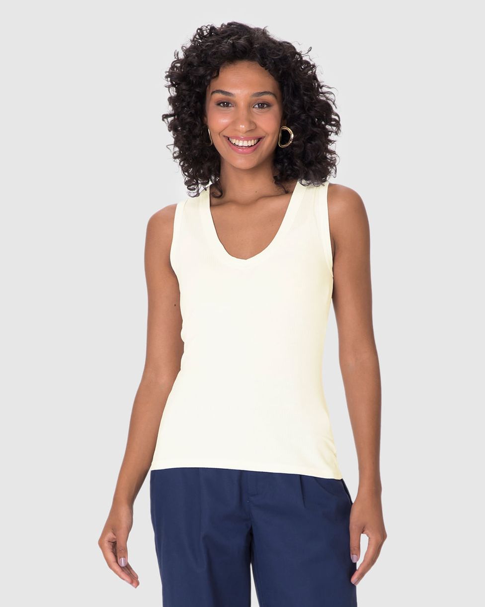 Regata Básica Feminina Decote V Alça Larga Em Malha Viscose Canelada