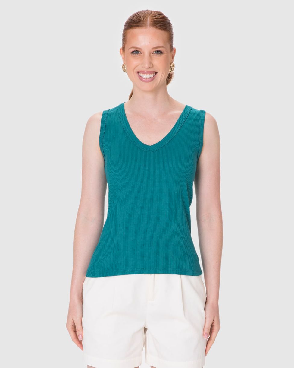 Regata Básica Feminina Decote V Alça Larga Em Malha Viscose Canelada